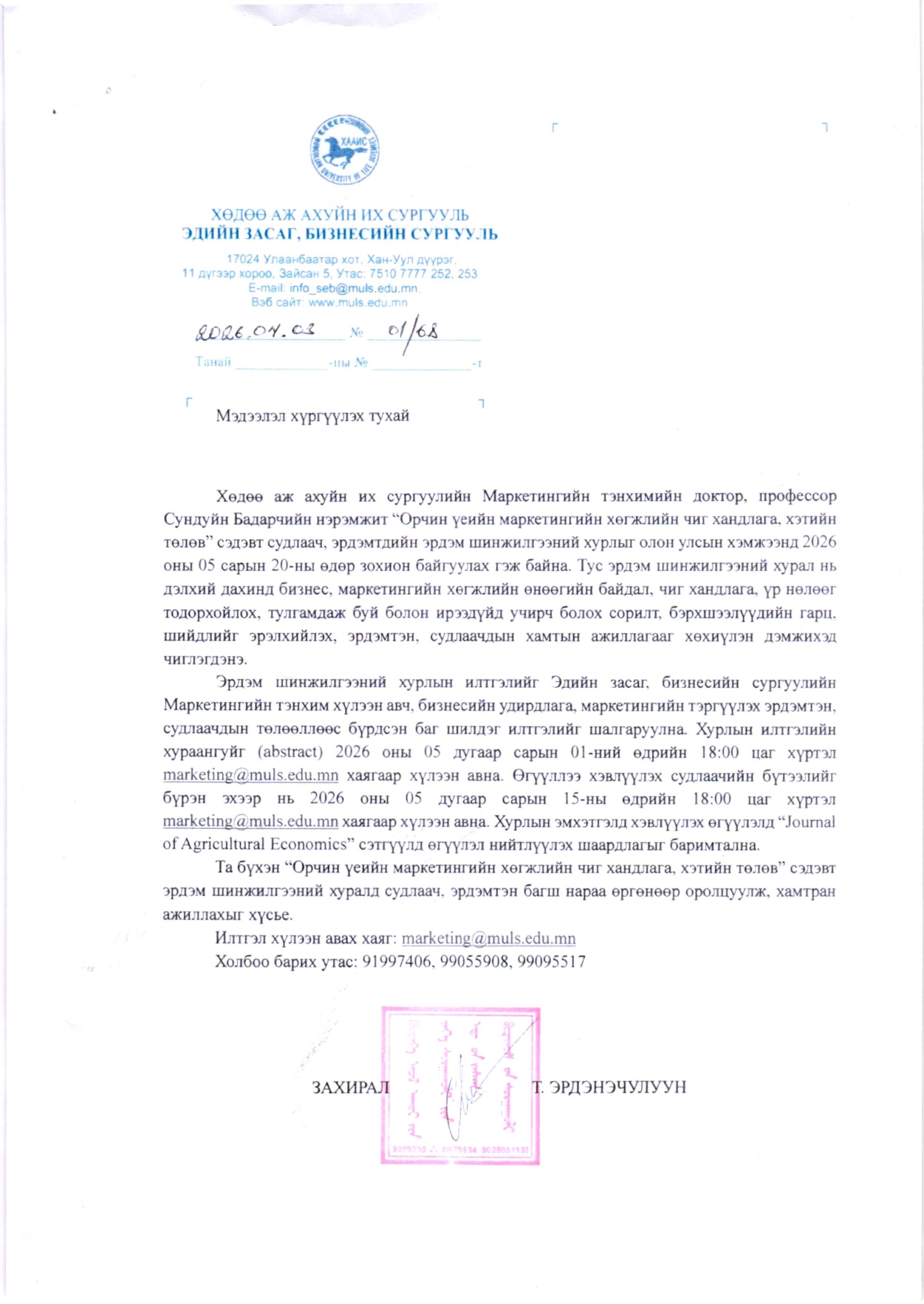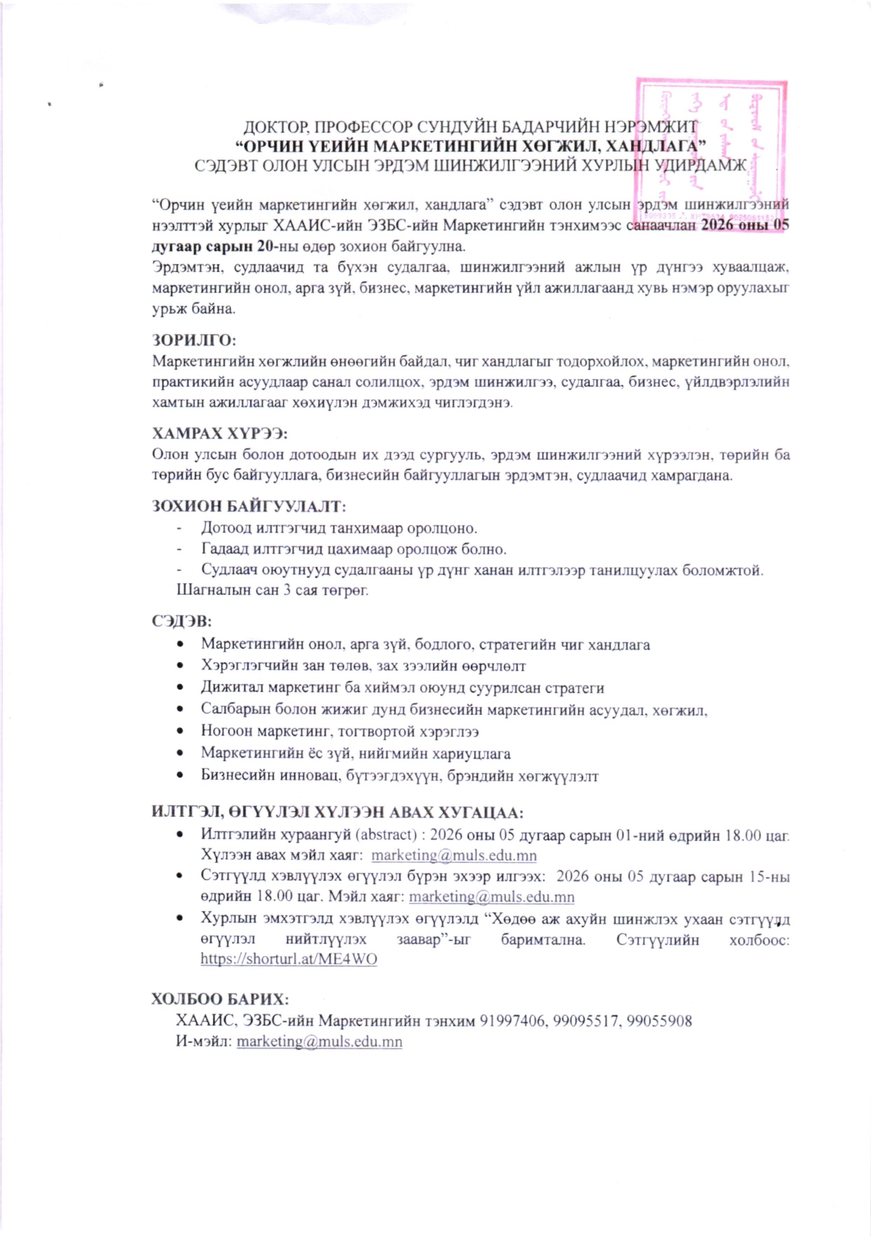 "ЭРДЭМ СУДЛАЛ 2026" Магистрант, докторантын эрдэм шинжилгээний хурлын хөтөлбөр орууллаа. Та бүхнийг урьж байна